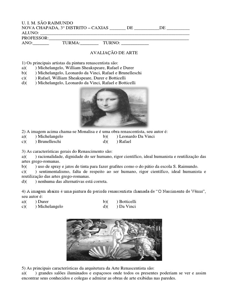Avaliação de Arte 8º | Renascimento | Leonardo da Vinci